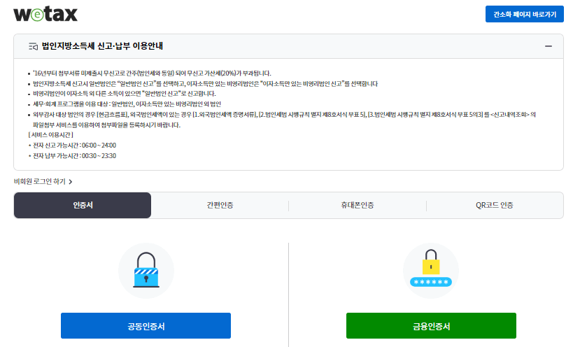 - 위택스 사이트로 이동 → 법인지방소득세 신고 화면으로 자동 연결