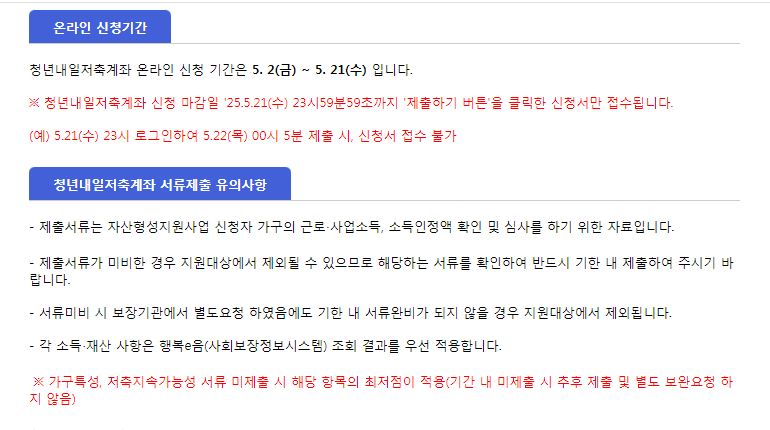 - 청년내일 저축계좌는 신청 기간 마감 직전은 접속 지연이 예상되므로 최소 하루 전 미리 제출하는 것이 안전합니다.