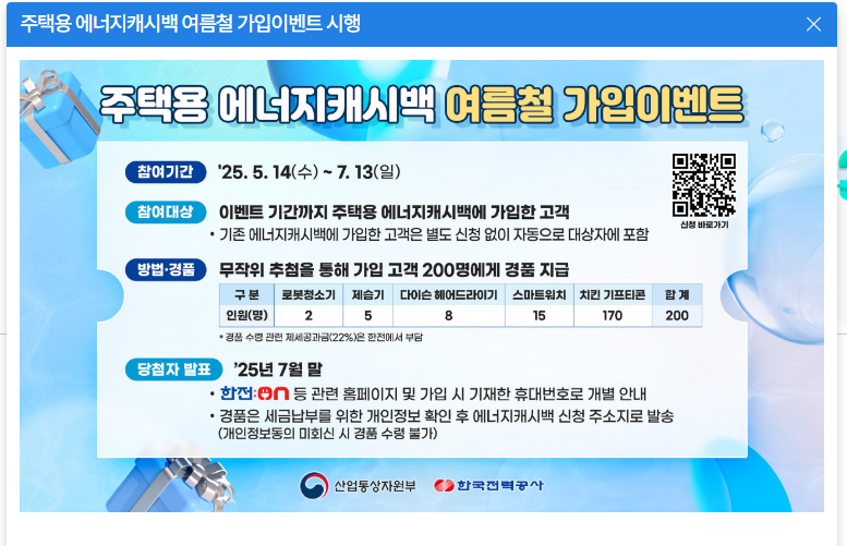 여름철 전기요금 부담을 줄이고 다양한 경품 기회까지! 지금 바로 '한전 에너지캐시백'에 가입하세요. 스마트한 절약, 현명한 선택은 여러분의 클릭 한 번에서 시작됩니다. 자 이제 다 함께 참여해 볼까요.